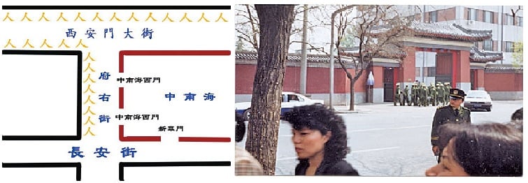 上面的左圖:「人」字表示法輪功學員在警察的指揮下所站的地方,處在中南海的西邊和北邊,而中南海南邊的正門——新華門、東邊根本沒有法輪功學員。