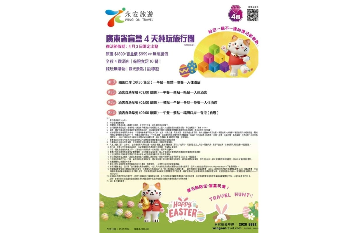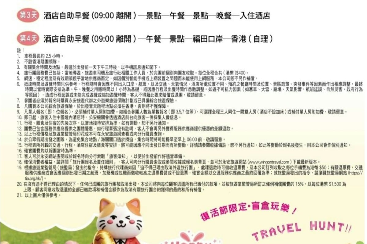 早前一連5日的復活節及清明節長假,不少港人離港旅遊。不過永安旅遊的「廣東省盲盒4天純玩旅行團」,卻在出發後方告知參加者往湖南省,其中一日因塞車,車程長逾6小時,最後一日更取消原定的唯一景點回程。旅遊業監管局指至本周三(22日)接獲15宗查詢及求助,正在跟進。