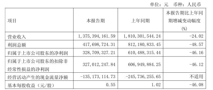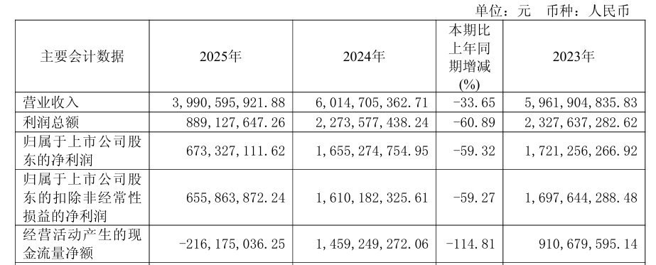 另外,「歸屬於上市公司股東的扣除非經常性損益的淨利潤655,863,872.24元,2024年1,610,182,325.61元,同比下滑59.27。經營活動產生的現金流量淨額下滑216,175,036.25元,2024年1,459,249,272.06元,同比下滑114.81%。」