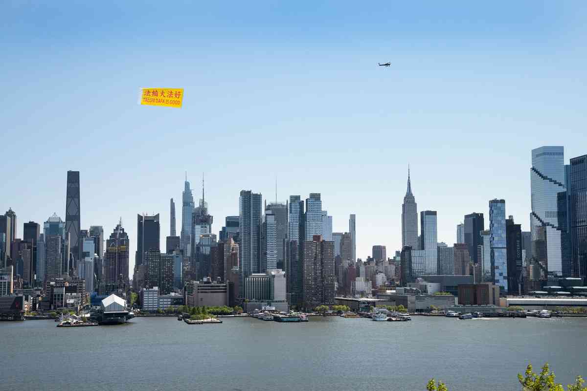 周五(4月24日),在中國法輪功學員「四二五」萬人和平上訪27周年前夕,一架小型飛機在紐約哈德遜河上空拉起「法輪大法好」(FALUN DAFA IS GOOD)的巨型橫額,醒目的出現在「世界之都」紐約天際線上。(戴兵/大紀元)