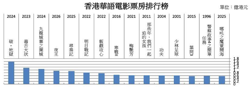 根據網站enjoymovie資料(見圖1),香港華語電影歷來票房排行榜中,至1996年起算30年內,《破・地獄》以1.58億元(港元,以下同)居首,《毒舌大狀》錄1.15億元排第二,《九龍城寨之圍城》則以1.08億元位列第三。