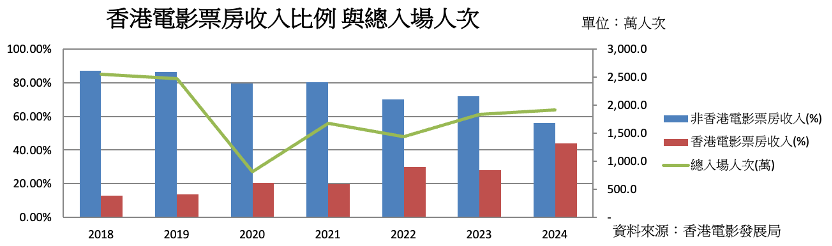 還有一點是,在整體市場規模收縮的背景下,本地電影票房佔比由疫情前約一成多,逐步上升至2024年逾四成,本地作品在市場中的份額持續擴大。