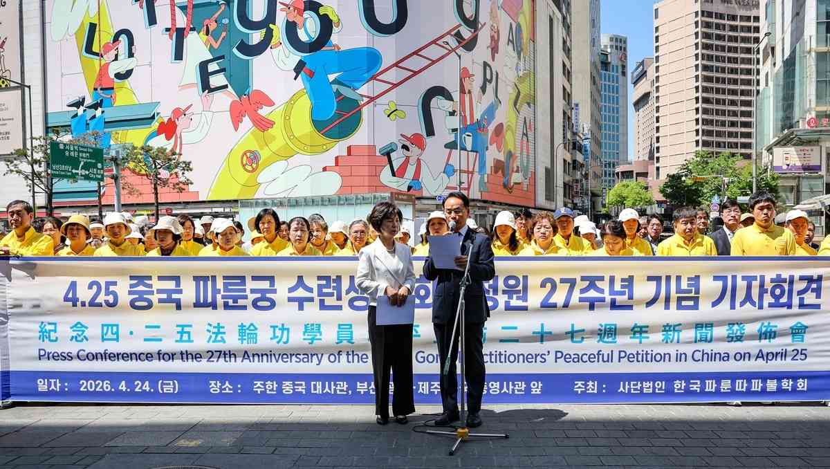 「4.25」和平上訪27周年來臨之際,韓國部份法輪功學員在中共大使館前舉辦集會及記者會、並進行一人靜坐接力抗議,以和平反迫害的精神,向各界講述法輪功真相。