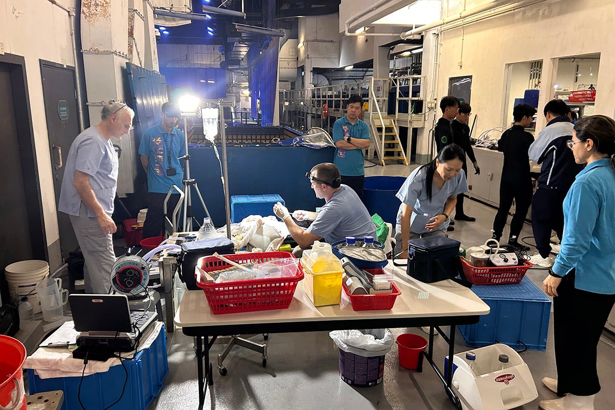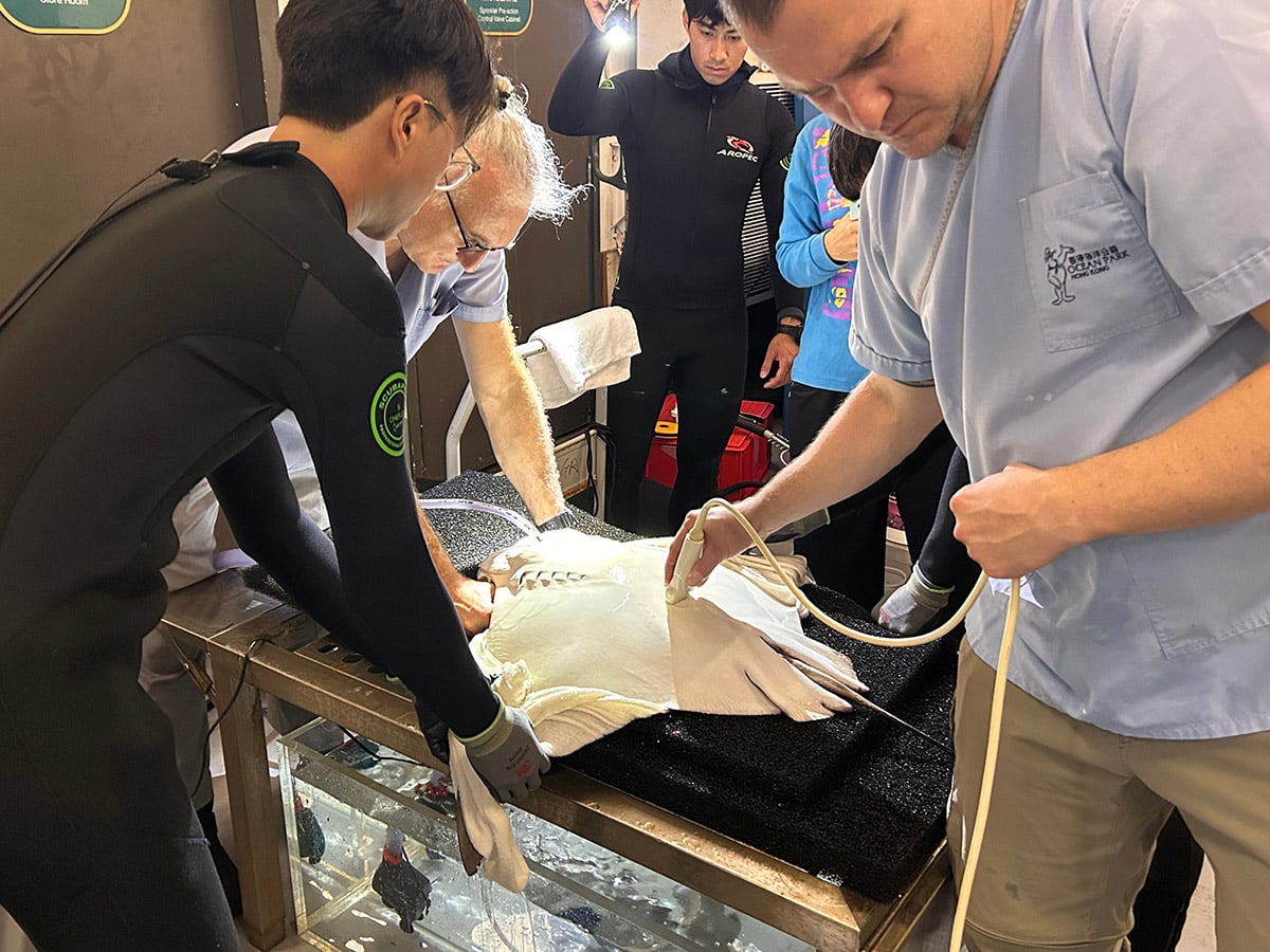 在3月下旬,海洋公園獸醫團隊早前為一條估計約20歲的雄性牛鼻鯆進行恆常身體檢查時,發現牠的體腔有不尋常積液,而且螺旋瓣腸位置持續突起。超聲波等進一步診斷檢查顯示,牠體腔內有包括魚頭及魷魚殘骸等異物,胃壁嚴重破裂,其後經電腦掃描(CT Scan)確定損傷性質及程度,須以手術介入,否則會致命。
