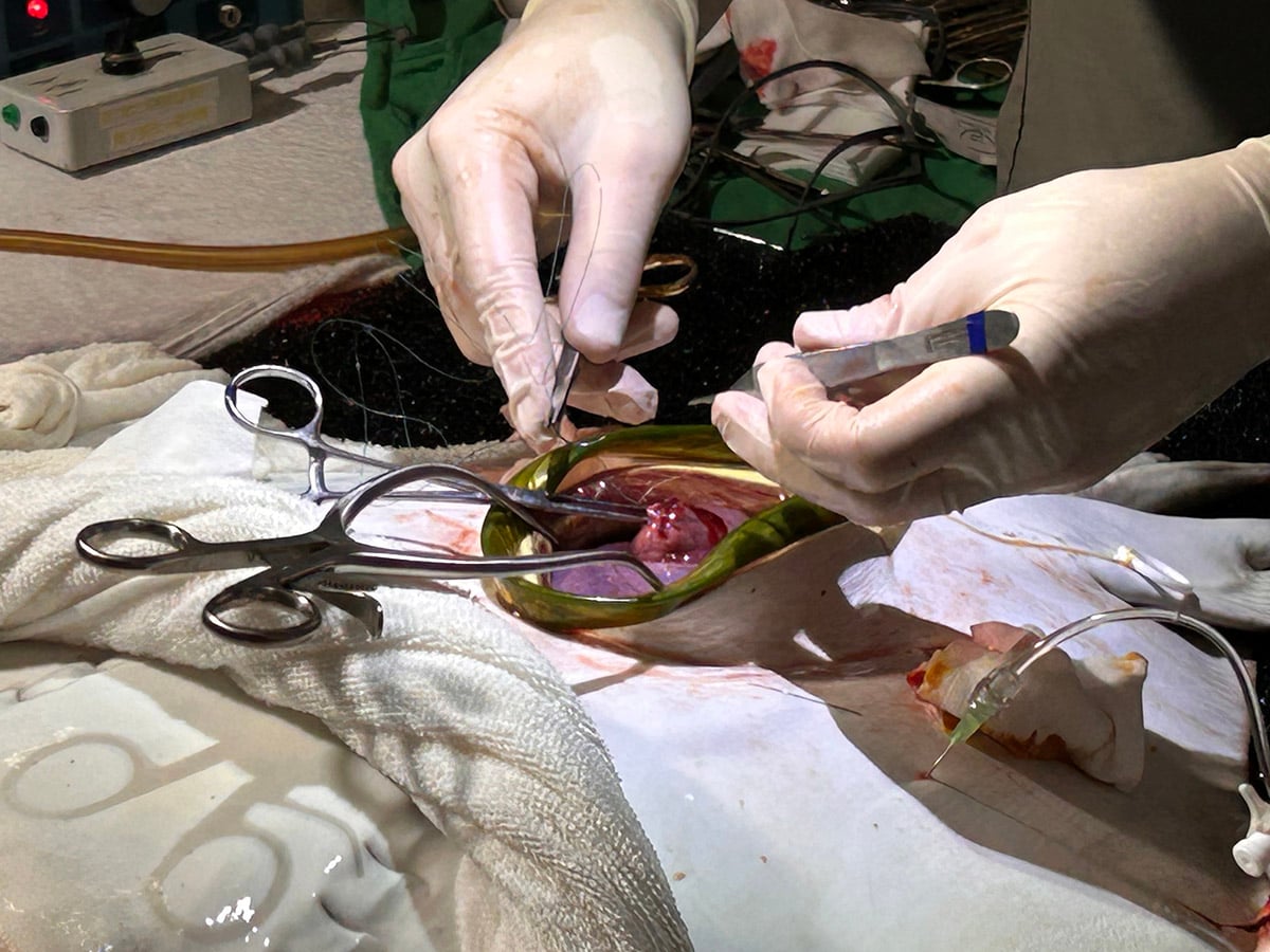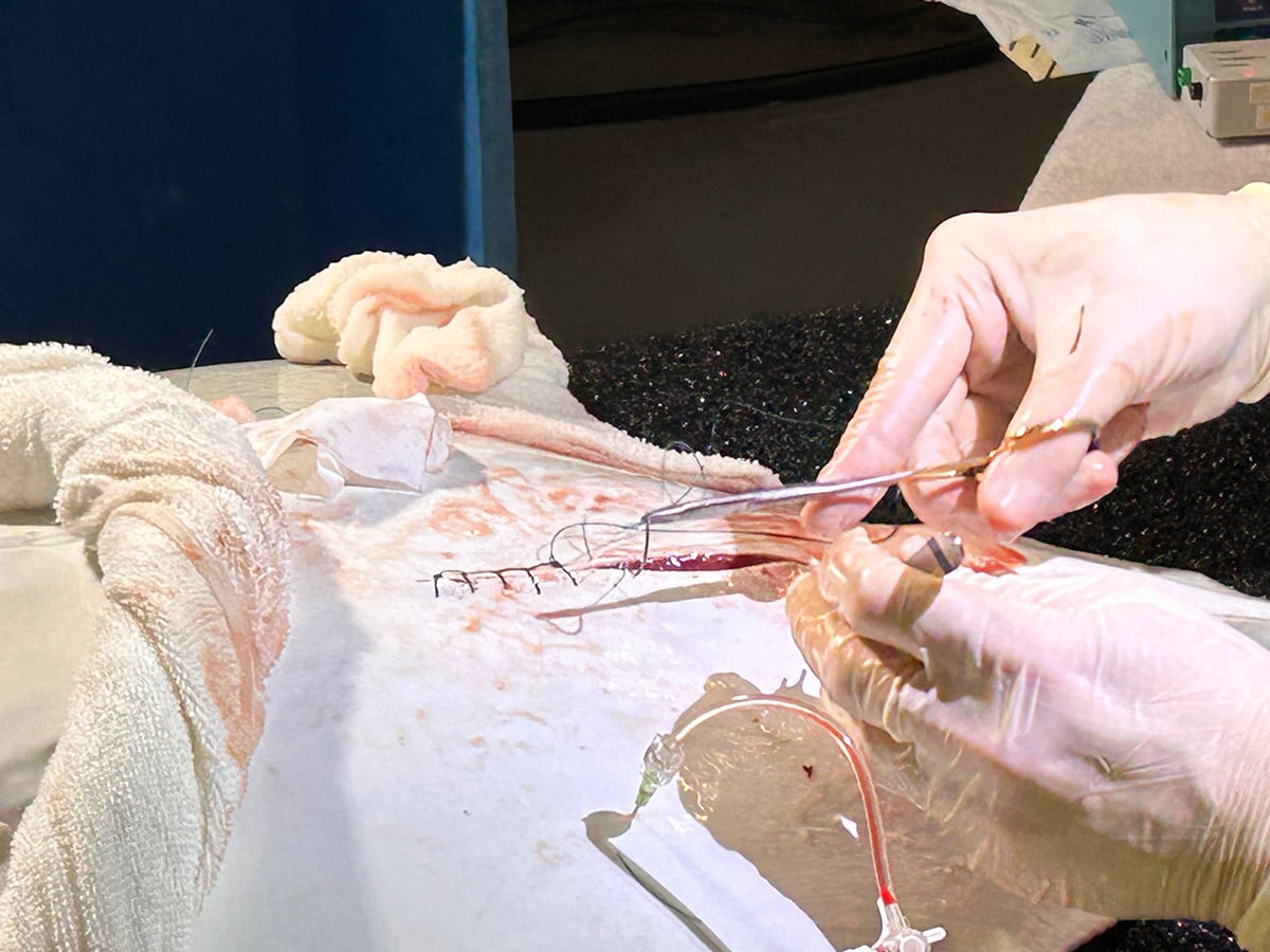 海洋公園獸醫團隊決定翌日便為該牛鼻鯆在全身麻醉下進行手術。手術過程歷時約兩小時,包括清除異物及仔細修補胃部破裂位置。團隊解釋,為軟骨魚類(包括鯊魚和鯆魚)做開刀手術極具挑戰,因在水外為完全水生的動物施行麻醉極為複雜,還有胃部手術固有的複雜性和風險,以及傷口癒合不良及術後感染的風險。