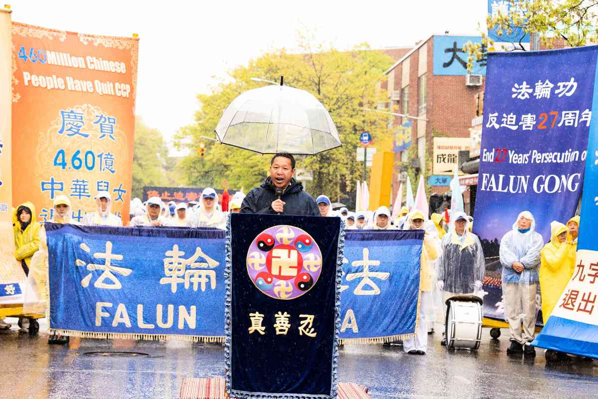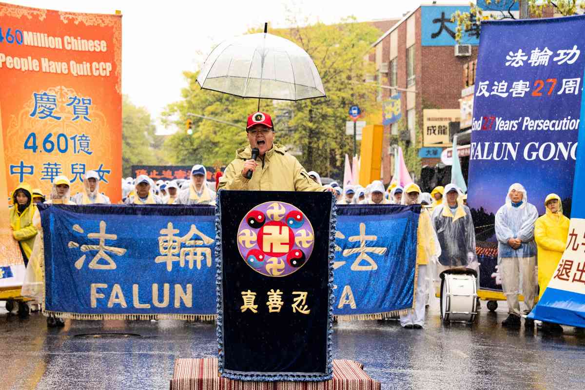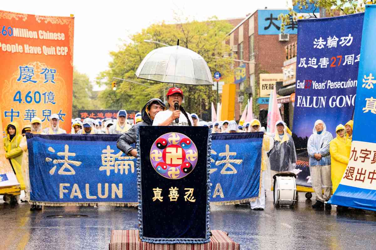 2026年4月25日,紐約部份法輪功學員在法拉盛遊行和集會,紀念「4.25和平上訪」27周年,聲援4.6億中國人退出中共黨團隊。中國新民黨主席楊茂森發言。(戴兵/大紀元)