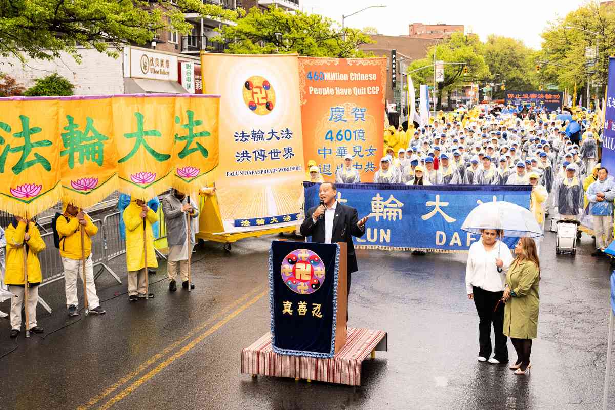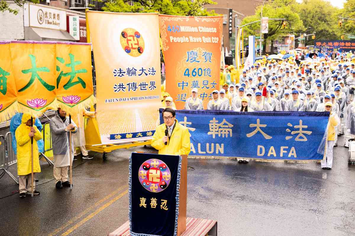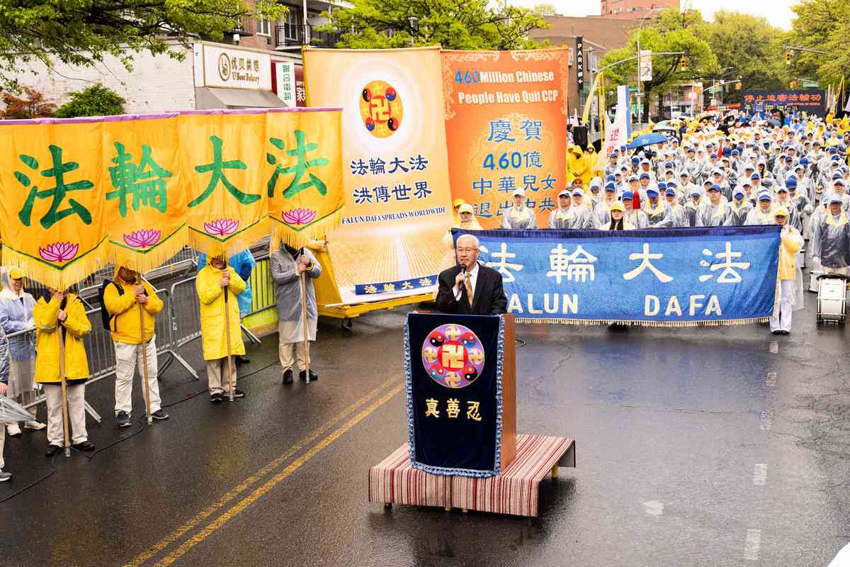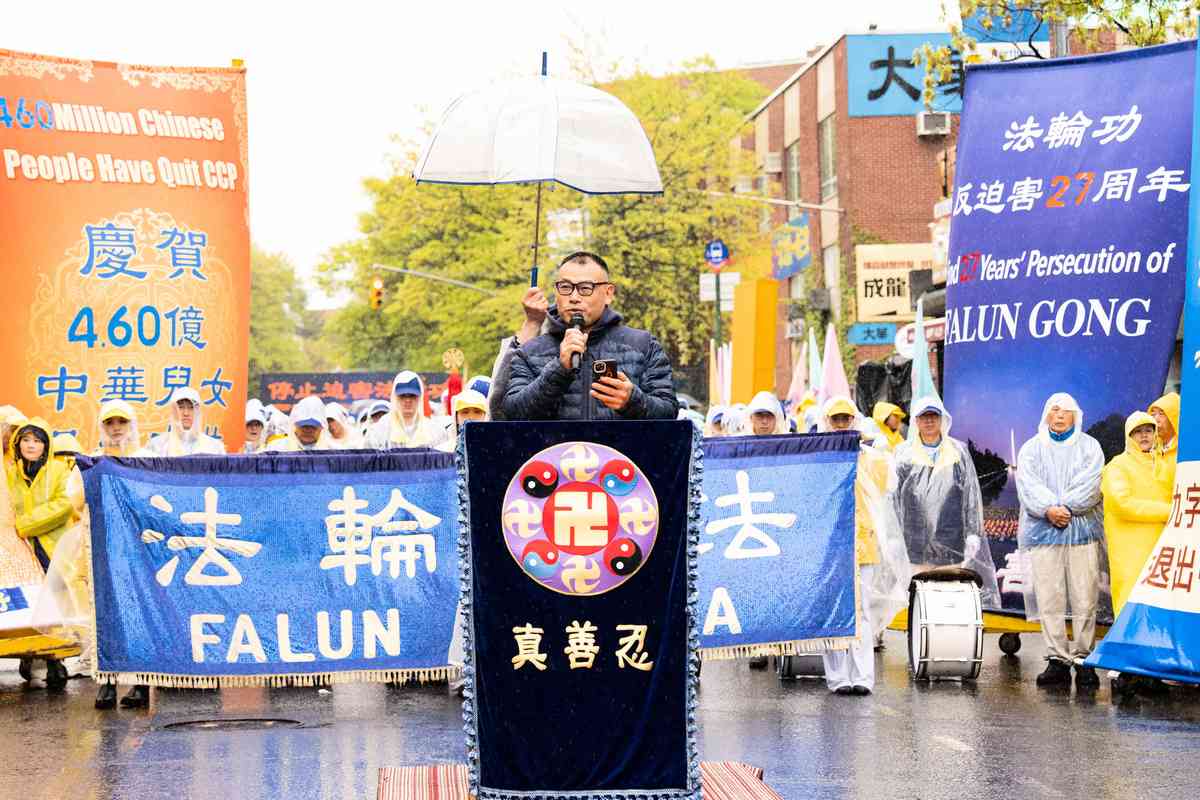 2026年4月25日,紐約部份法輪功學員在法拉盛遊行和集會,紀念「4.25和平上訪」27周年,聲援4.6億中國人退出中共黨團隊。中國新民黨主席楊茂森發言。(戴兵/大紀元)