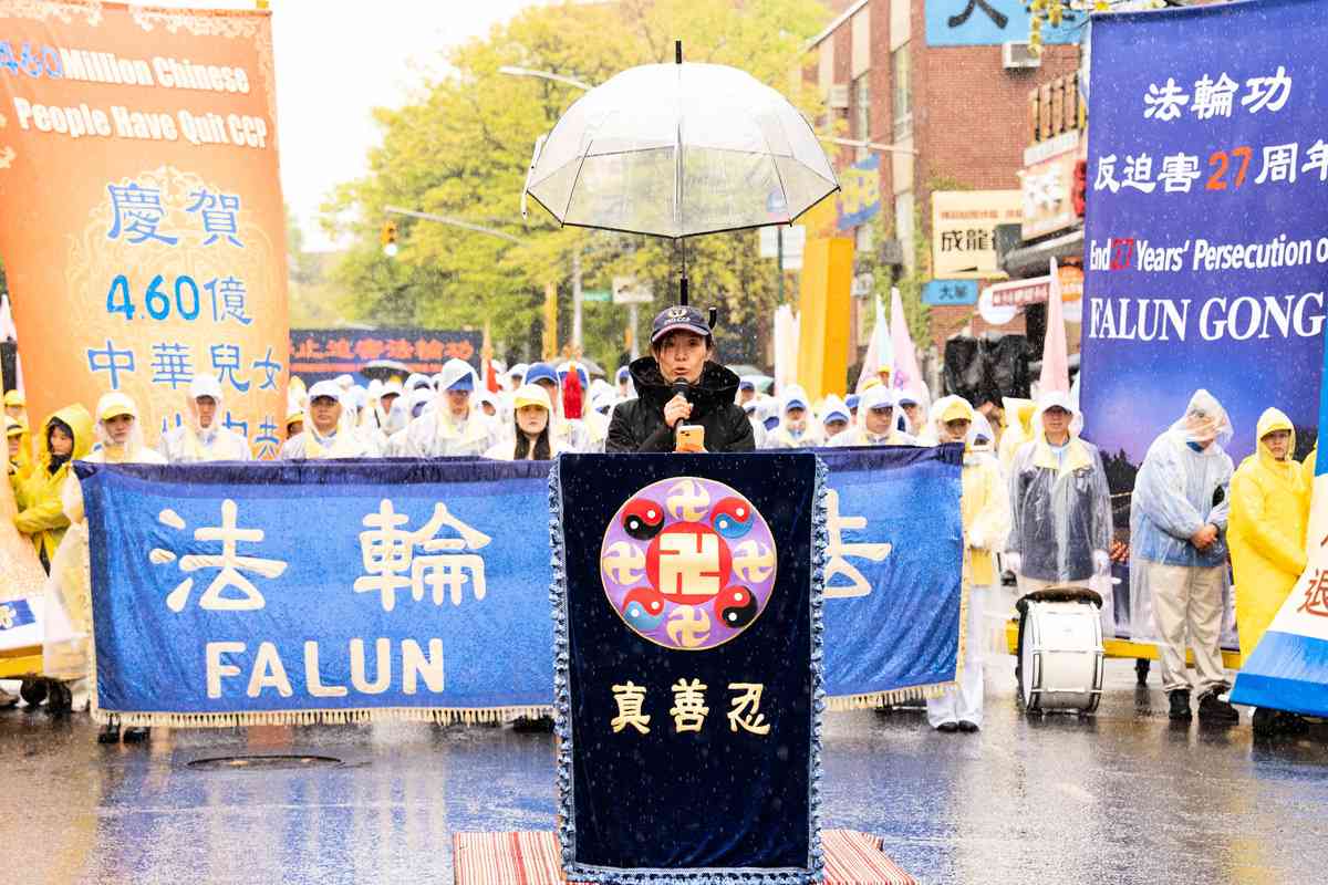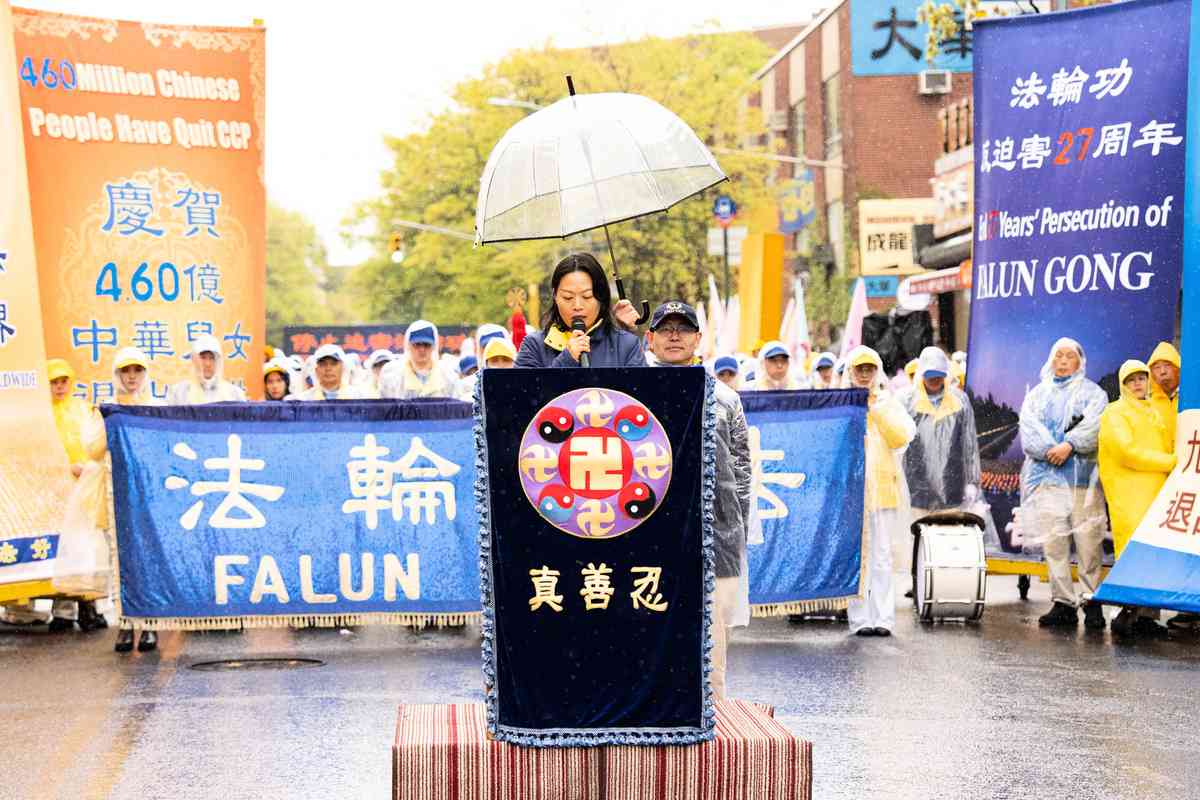 2026年4月25日,紐約部份法輪功學員在法拉盛遊行和集會,紀念「4.25和平上訪」27周年,聲援4.6億中國人退出中共黨團隊。中國民主人權聯盟主席金秀紅發言。(戴兵/大紀元)