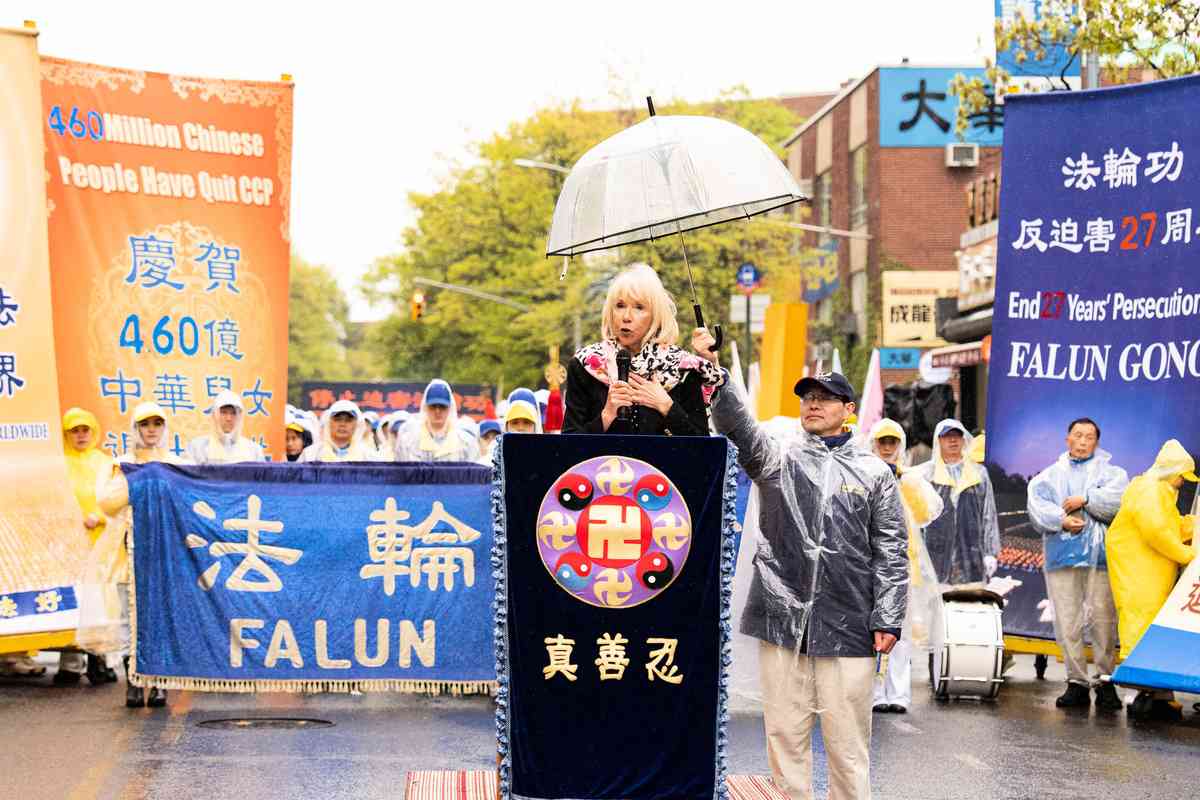 2026年4月25日,紐約部份法輪功學員在法拉盛遊行和集會,紀念「4.25和平上訪」27周年,聲援4.6億中國人退出中共黨團隊。「名流國際」會員、美國資深女星、製片Pat Patterson發言。(戴兵/大紀元)