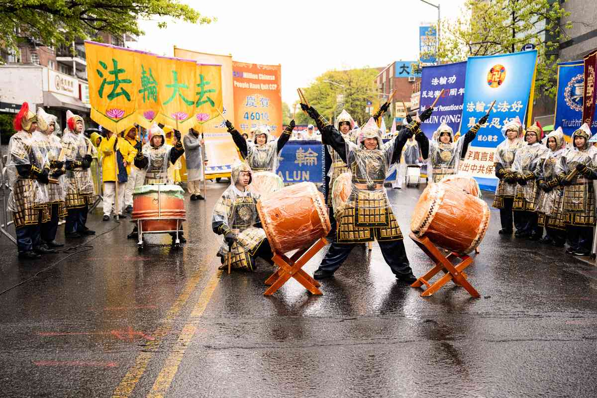 2026年4月25日,紐約部份法輪功學員在法拉盛遊行和集會,紀念「4.25和平上訪」27周年,聲援4.6億中國人退出中共黨團隊。Tonbane Taiko「跳躍太鼓」 太古表演。(戴兵/大紀元)