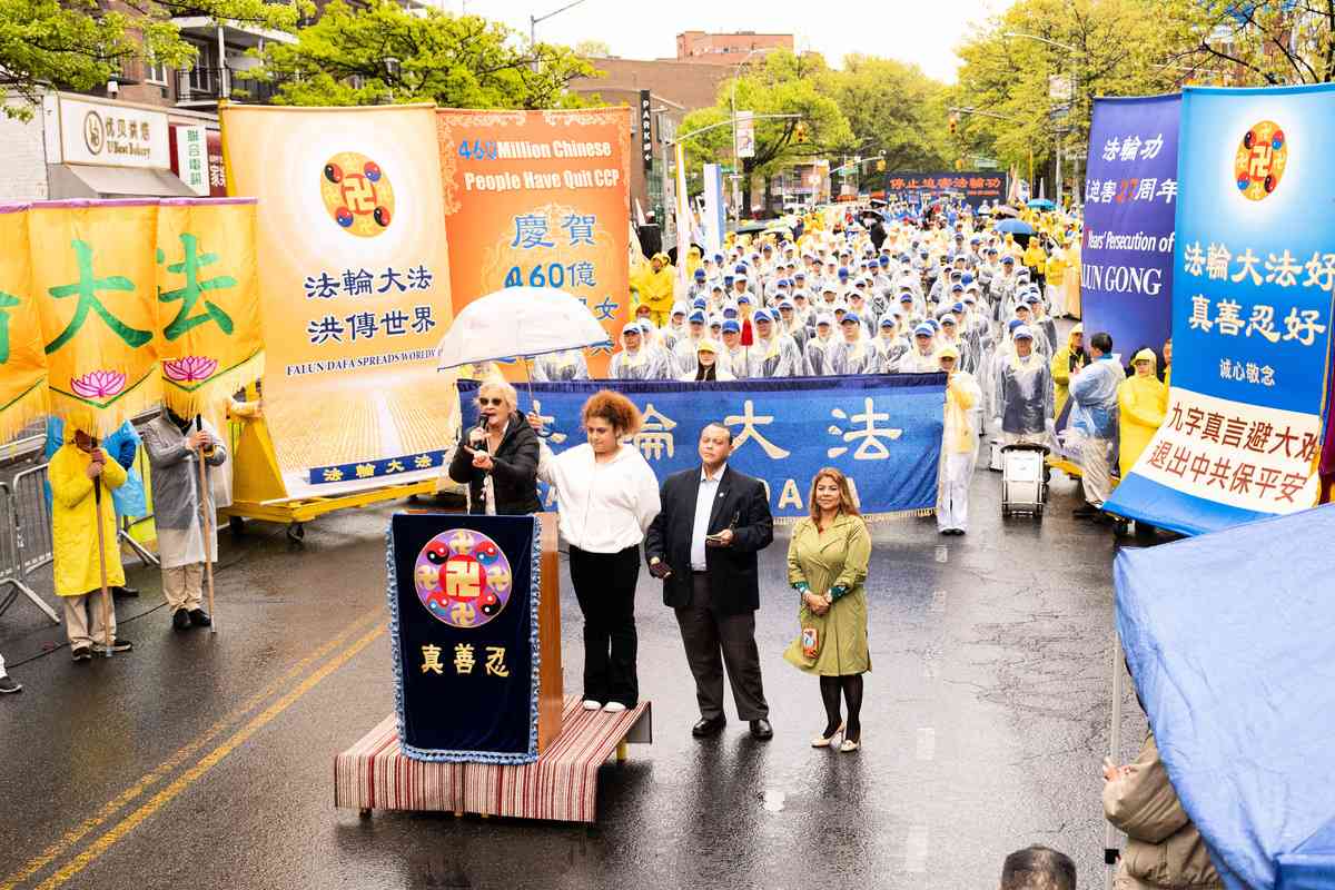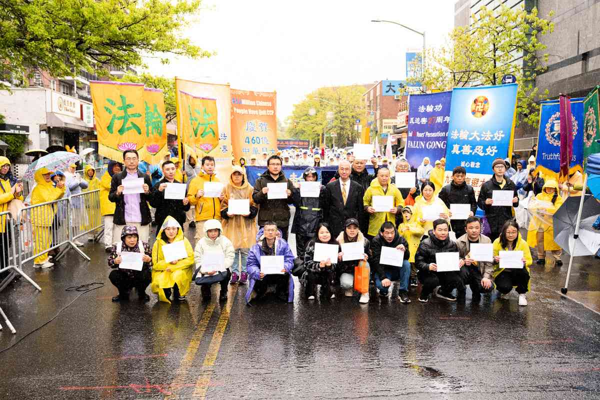 2026年4月25日,紐約部份法輪功學員在法拉盛遊行和集會,紀念「4.25和平上訪」27周年,聲援4.6億中國人退出中共黨團隊。退黨中心主席汪志遠現場頒發退黨證明。(戴兵/大紀元)