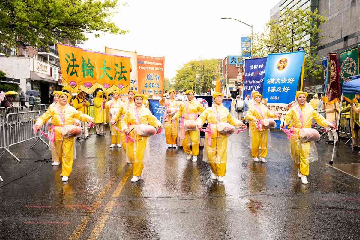 2026年4月25日,紐約部份法輪功學員在法拉盛遊行和集會,紀念「4.25和平上訪」27周年,聲援4.6億中國人退出中共黨團隊。腰鼓隊表演。(戴兵/大紀元)