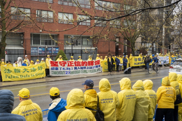 4月25日,多倫多部份法輪功學員在中領館前集會,以紀念4.25和平上訪27周年。(艾文/大紀元)