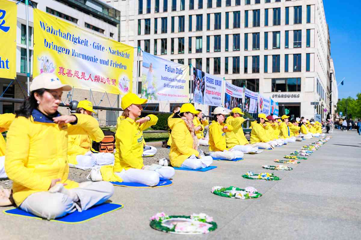 4月25日下午,德國柏林部份法輪功學員在勃蘭登堡門前舉行紀念4.25和平上訪活動。(張清颻/大紀元)