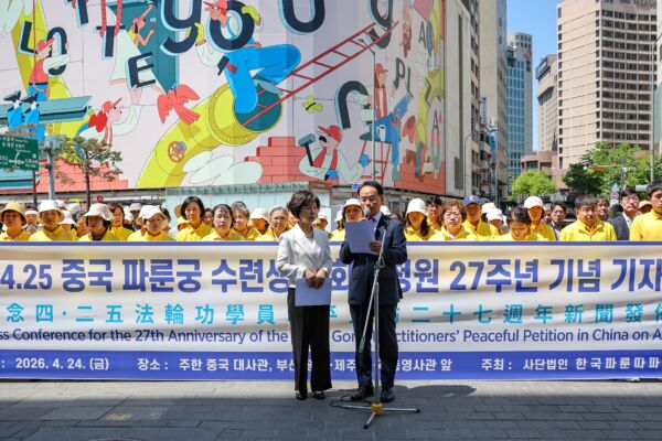 4月24日上午,部份法輪功學員在韓國首爾駐韓中共大使館前舉辦記者會,紀念4.25和平請願。(韓基民/大紀元 )