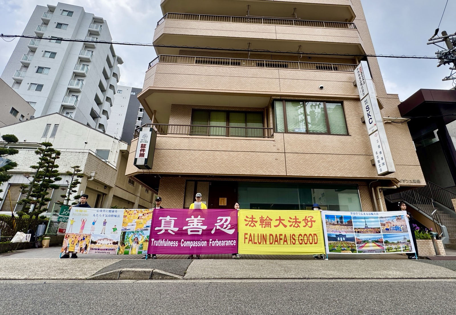 4月25日上午,部份名古屋法輪功學員在名古屋中領館前和平請願。(明慧網)