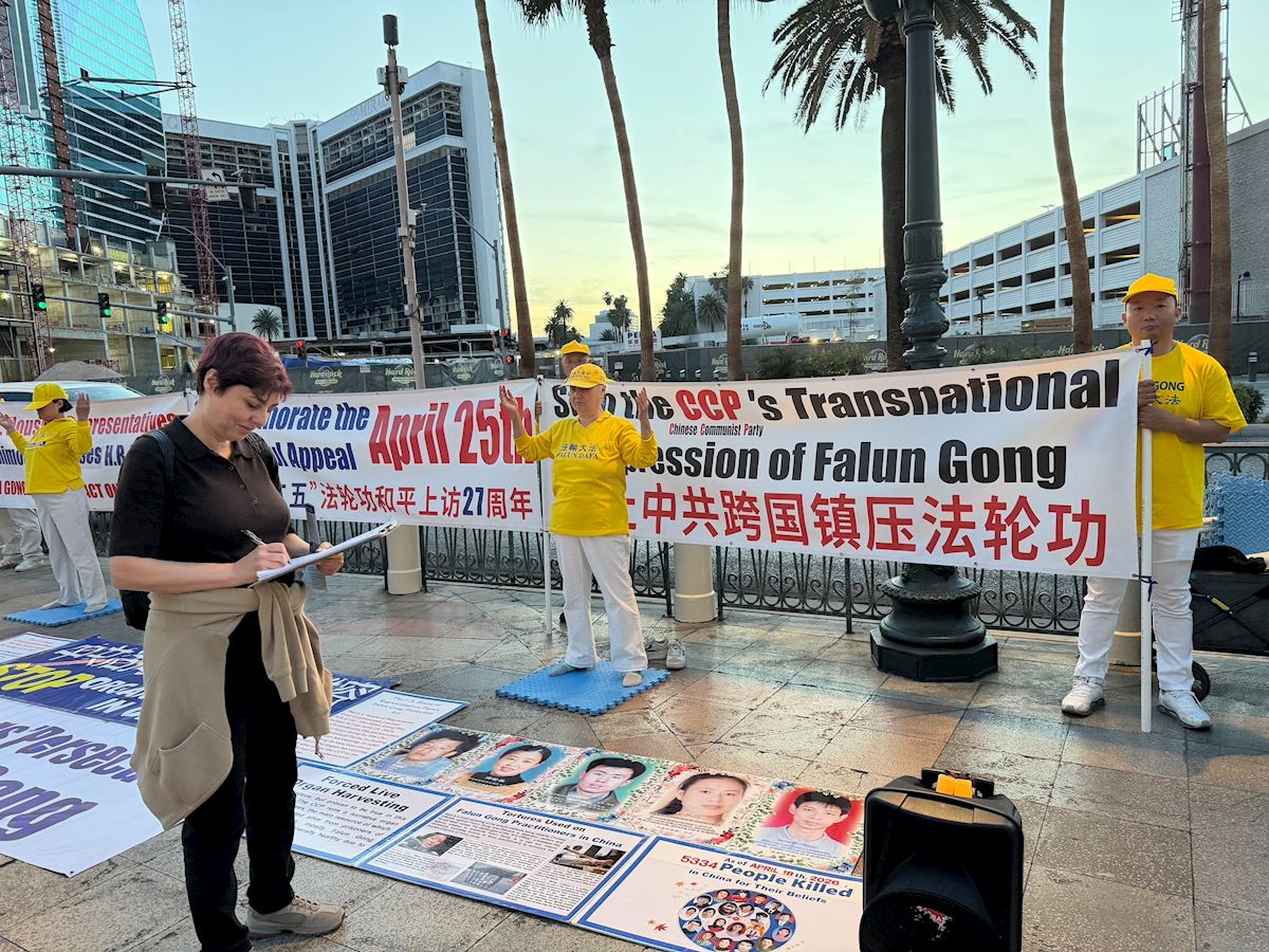 4月23日,洛杉磯部份法輪功學員數百人在洛杉磯市政府前集會,紀念4.25和平上訪27周年。(李旭生/大紀元)