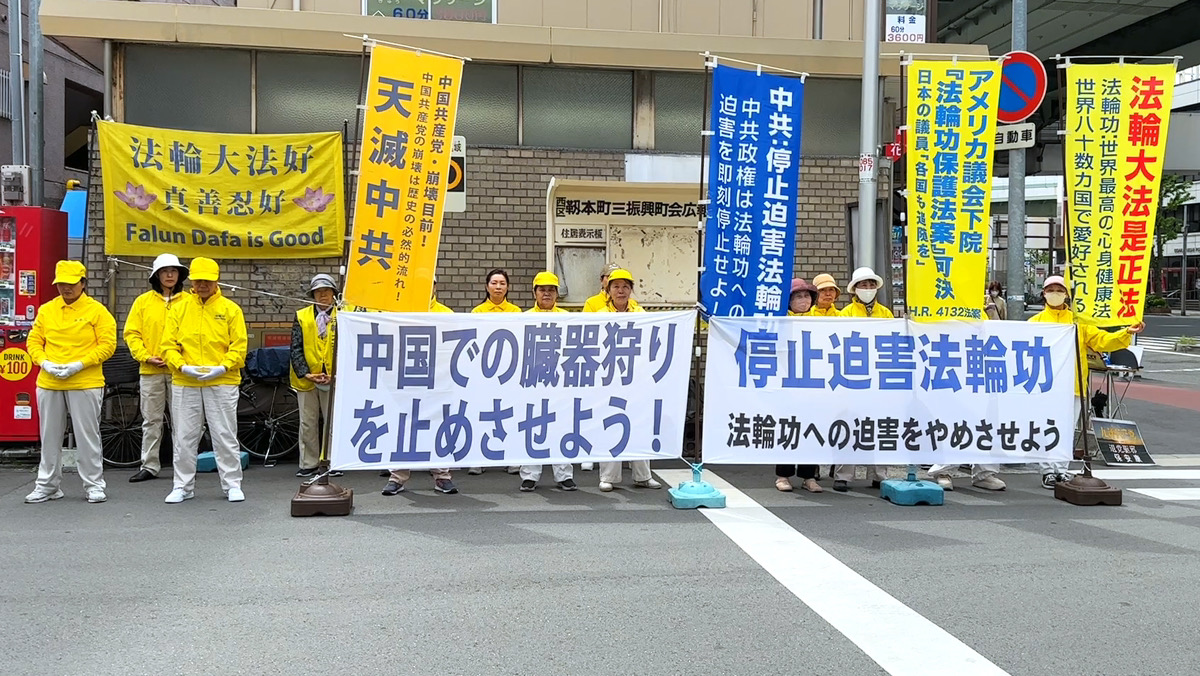 4月21日,關西地區部份法輪功學員來到大阪中領館前和平請願,呼籲中共立即停止迫害法輪功。(明慧網)