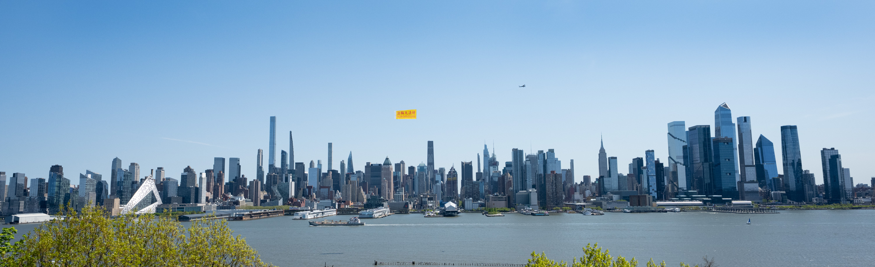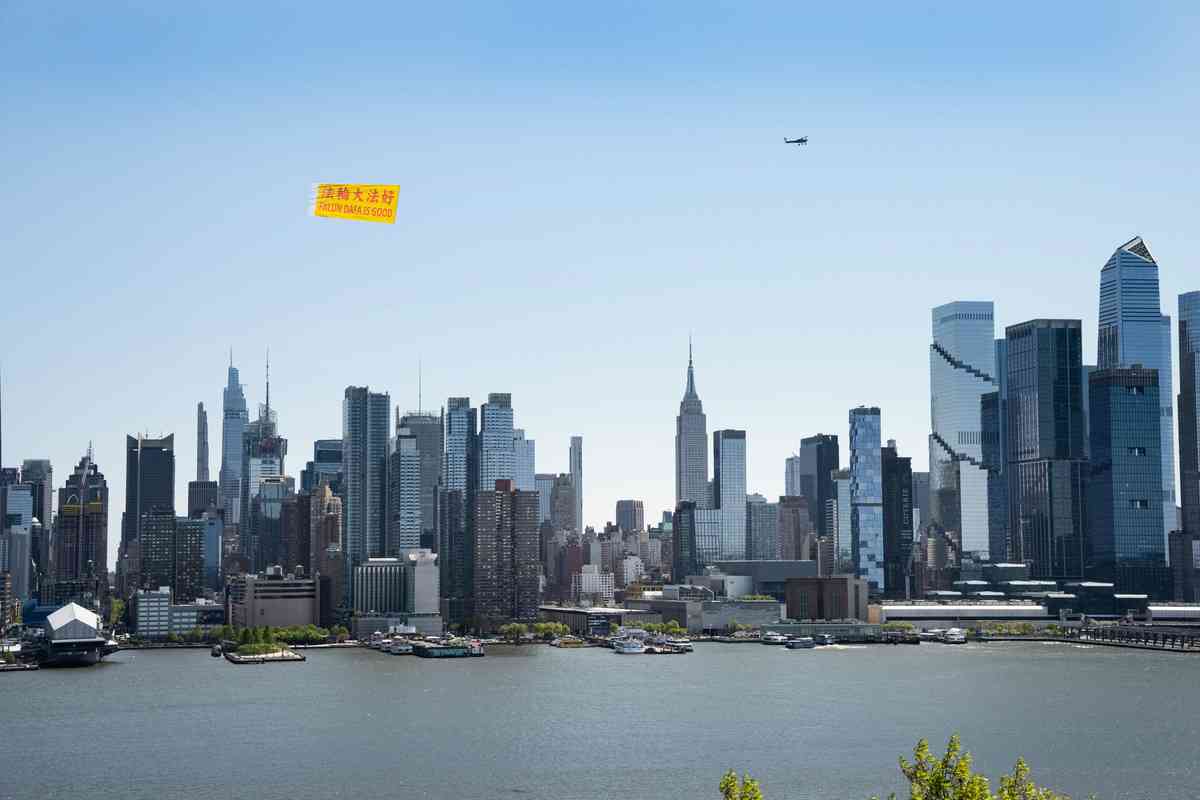 4月24日,在中國法輪功學員4.25萬人和平上訪27周年前夕,一架小型飛機在紐約哈德遜河上空拉起「法輪大法好」(FALUN DAFA IS GOOD)的巨型橫額,醒目的出現在「世界之都」紐約天際線上。(戴兵/大紀元)