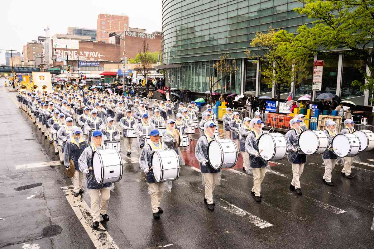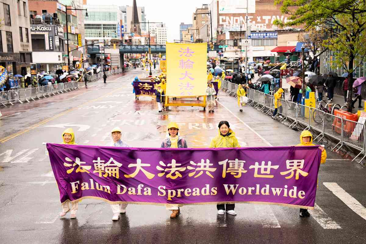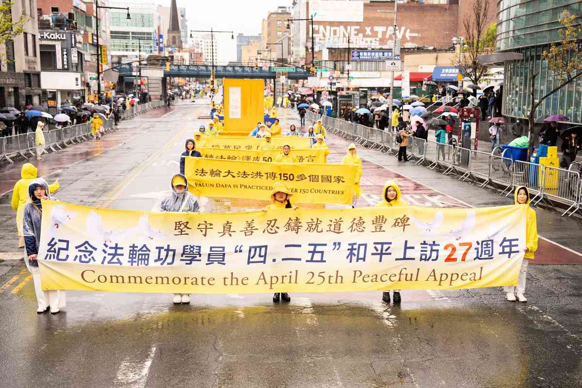 4月25日,美國大紐約地區部份法輪功學員在法拉盛舉行了盛大的遊行活動,紀念4.25萬人和平上訪27周年。(戴兵/大紀元)