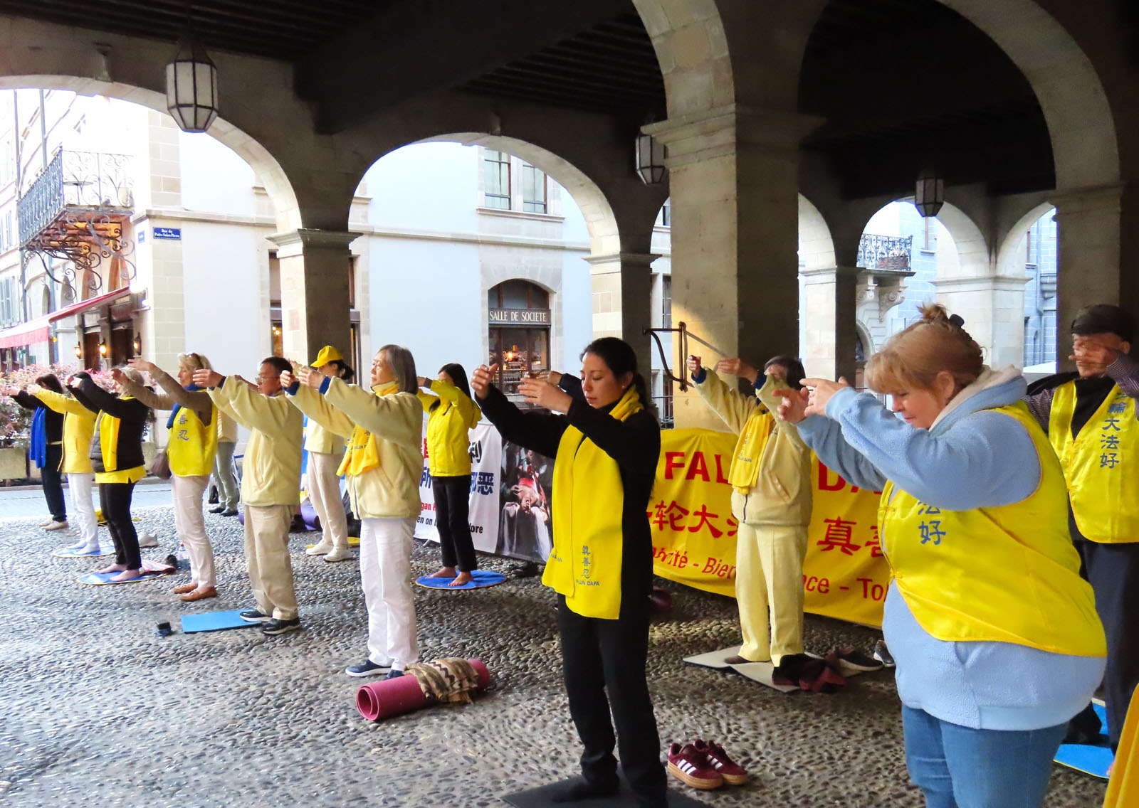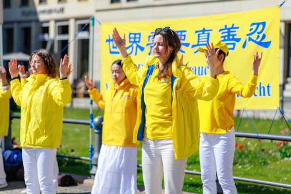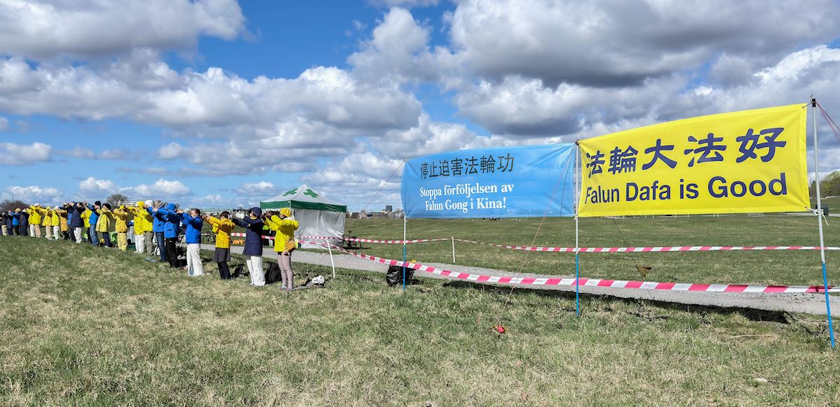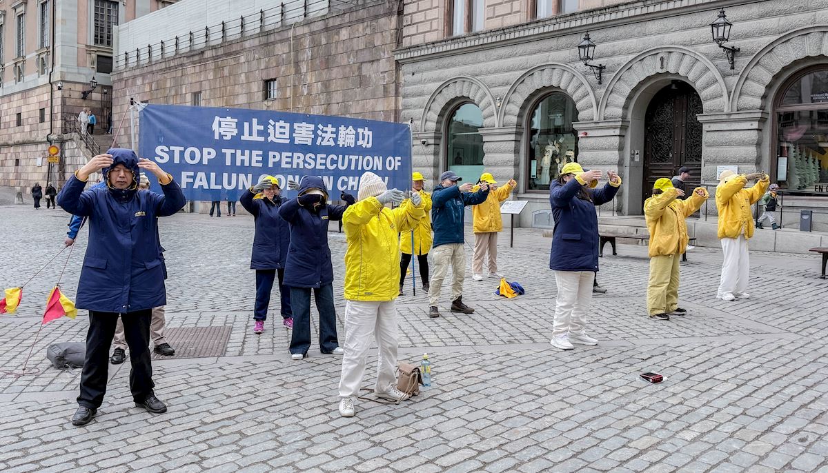 4月25日,法輪功學員在斯德哥爾摩市中心國會大廈旁的錢幣廣場上集體煉功,講法輪功真相。(明慧網)