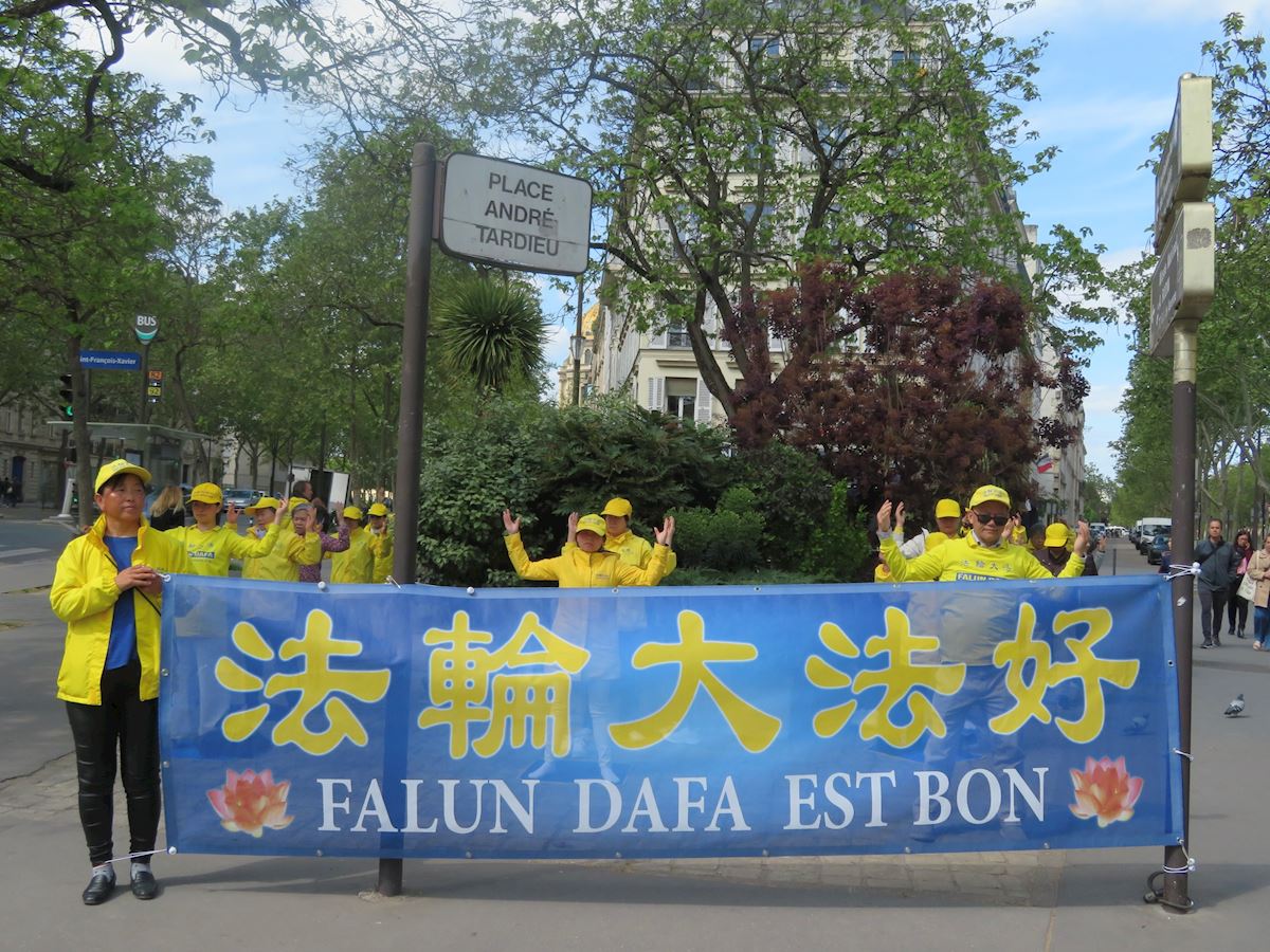 4月20日下午,法輪功學員在巴黎安德烈塔迪厄廣場演示法輪功功法,紀念4.25和平上訪。(明慧網)