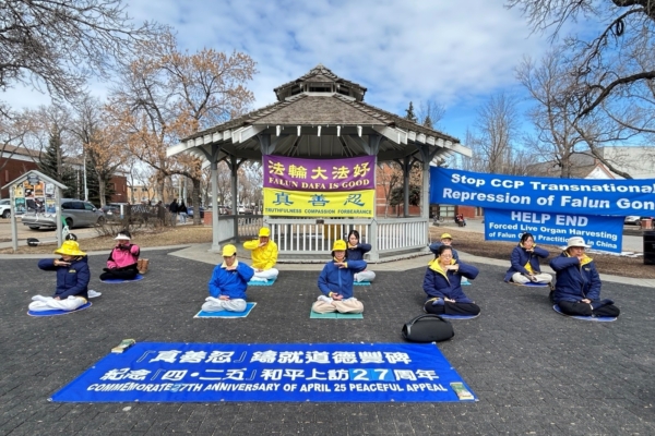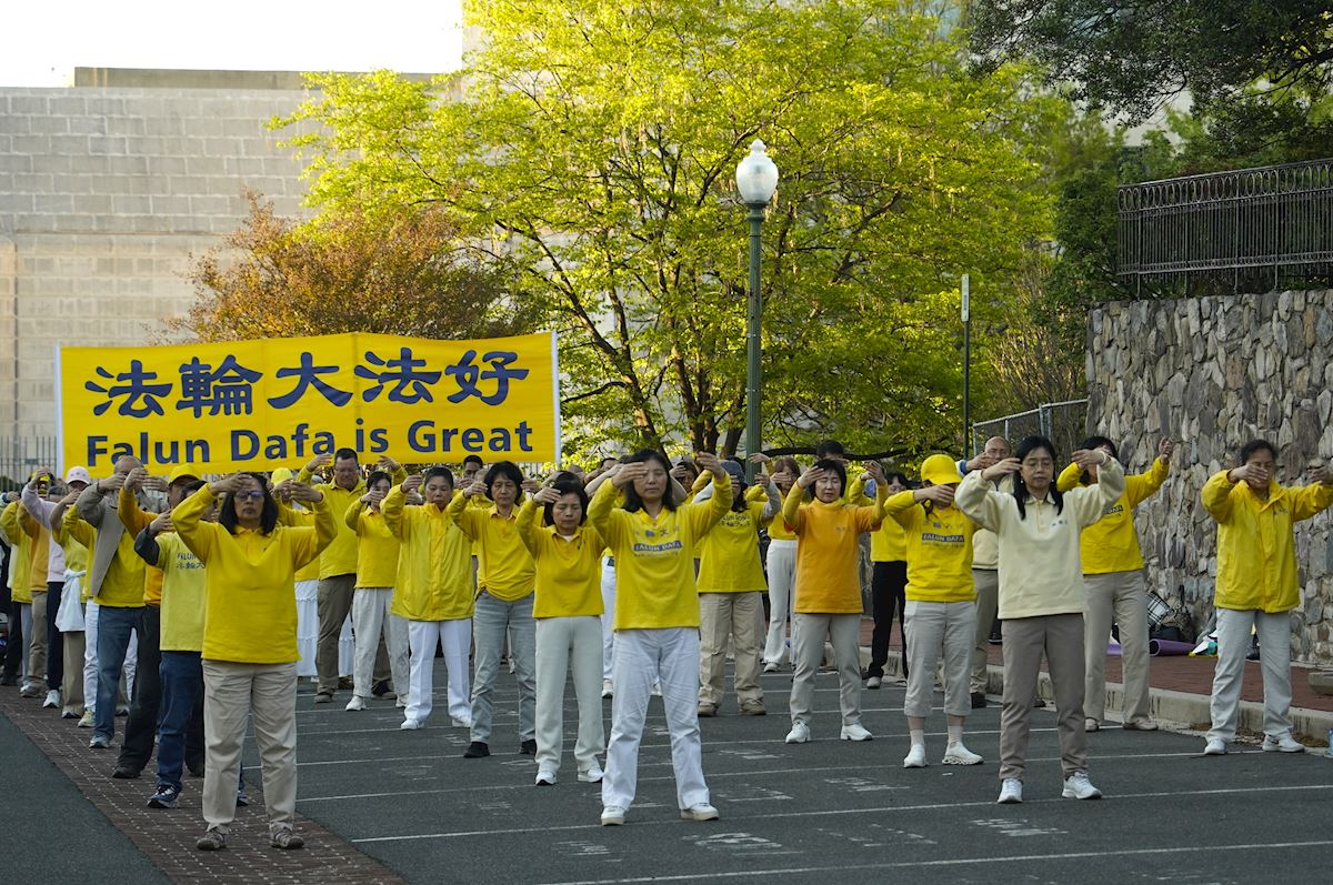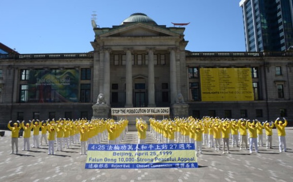 4月25日,溫哥華部份法輪功學員在藝術館北側廣場舉辦集體煉功,紀念4.25和平上訪27周年。(宇生/大紀元)