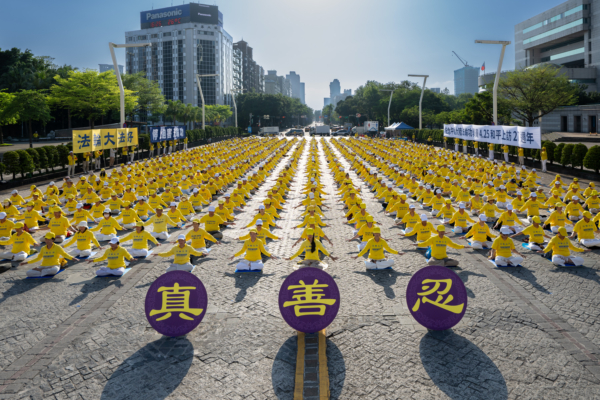 4月19日,台北地區部份法輪功學員在台北市政府廣場前舉辦「紀念中國大陸法輪功學員4.25和平上訪27周年」活動。(宋碧龍/大紀元)