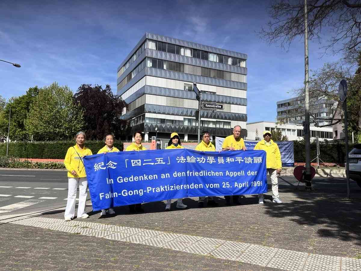 4月24日,法蘭克福部份學員在中領館前舉行紀念4.25和平上訪活動。(大紀元)