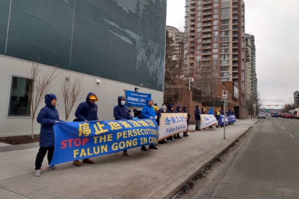 4月24日下午,卡加利部份法輪功學員在中領館前紀念4.25和平上訪27周年。(林采楓/大紀元)