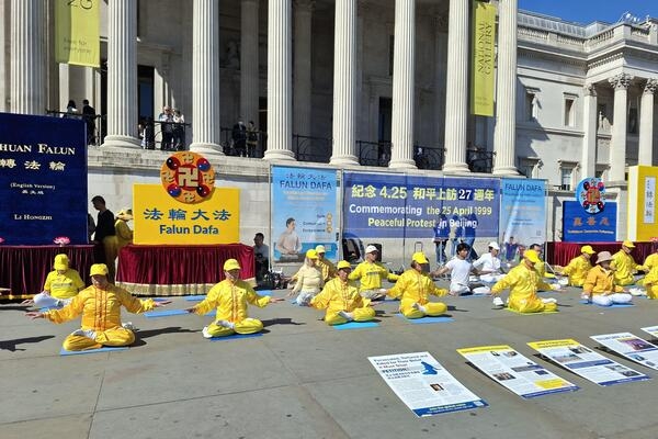4月25日,英國部份法輪功學員在倫敦市中心舉行遊行、集會活動,紀念4·25和平上訪27周年。(李真百/大紀元)