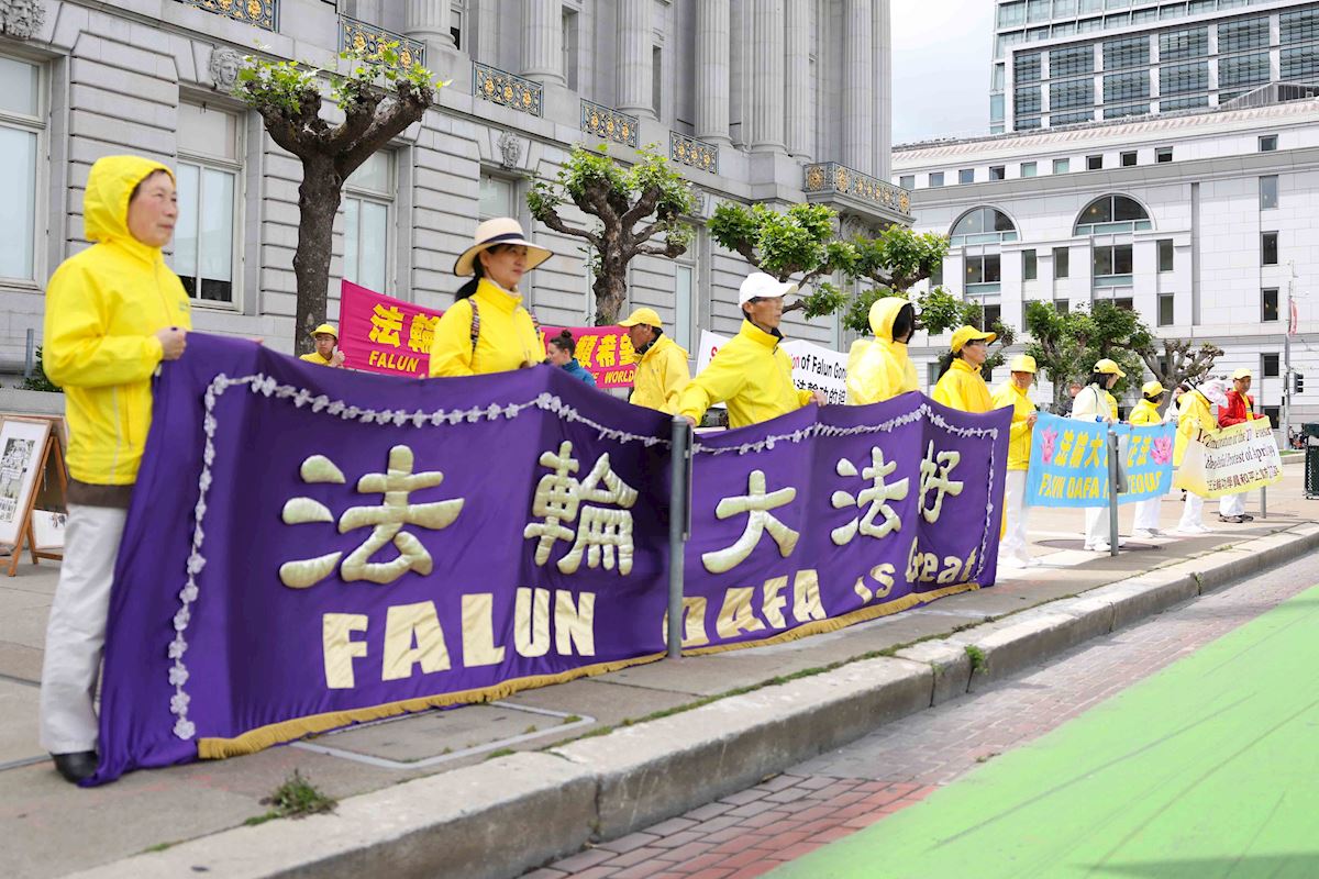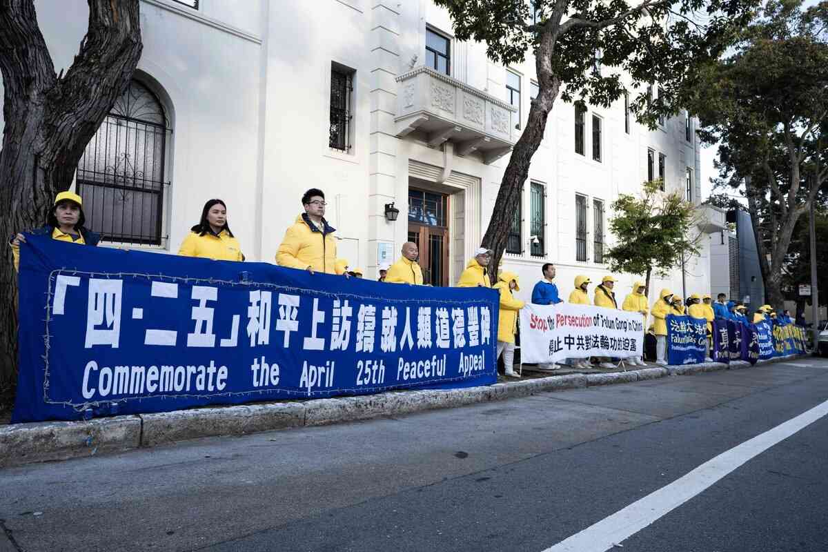 2026年4月24日,三藩市灣區的法輪功學員聚集在三藩市的中領館前,紀念4.25和平上訪27周年。(周容/大紀元)