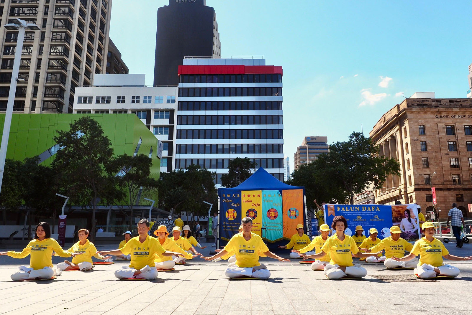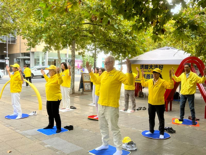 4月18日,澳洲昆士蘭法輪功學員在布里斯本廣場(Brisbane Square)舉行了集體煉功和講真相活動,紀4.25法輪功學員和平上訪。(明慧網)