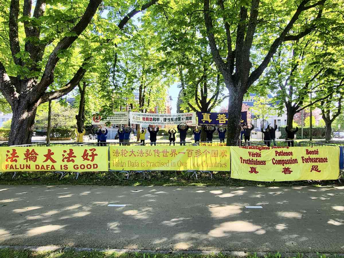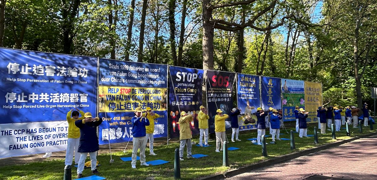 4月23日,荷蘭部份法輪功學員在海牙中使館集會,呼籲停止迫害。(明慧網)