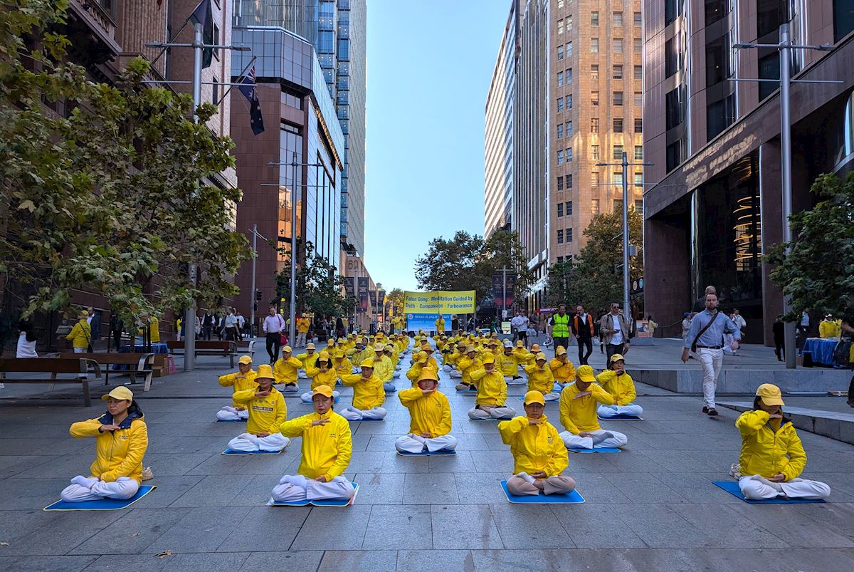 4月16日,為紀念4.25萬人上訪,揭露中共跨國鎮壓,法輪功學員在澳洲悉尼金融商業中心馬丁廣場(Martin Place)舉行大型活動。(明慧網)