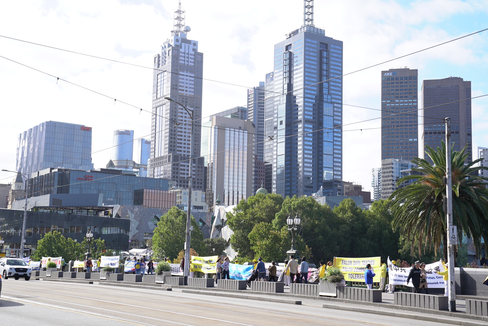 4月18日下午,澳洲墨爾本部份法輪功學員在市中心王子橋築起「勇氣長城」,紀念4.25和平上訪27周年。(Tien Nguyen/大紀元)