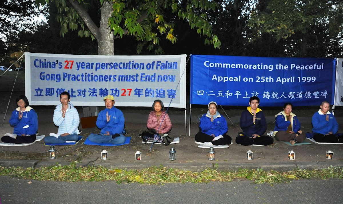 4月24日傍晚,澳洲首都坎培拉部份法輪功學員在中共駐澳大使館前集會,紀念萬名法輪功學員和平上訪27周年。(明慧網)
