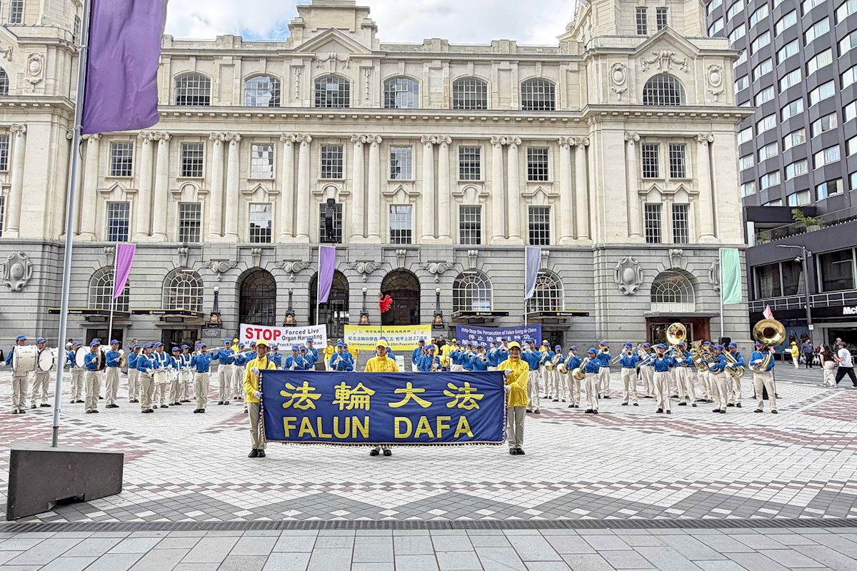 4月18日,紐西蘭法輪功學員在奧克蘭市中心的商業灣廣場舉行集體煉功,紀念4.25和平上訪。(明慧網)
