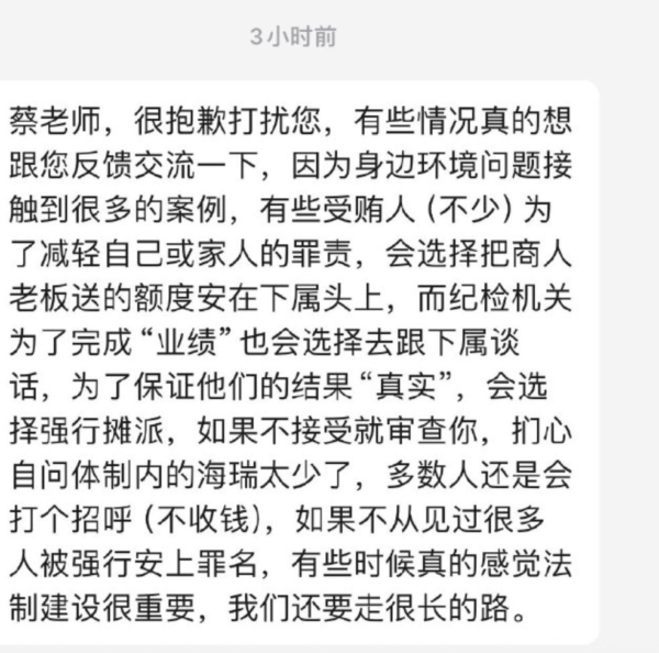 一名微博知名法律博客近日也發帖爆料一網民發來的私信稱,中共紀委為了完成「業績」給官員按罪名。一名疑似紀委內部人員稱,不少受賄官員被紀委查了以後,為了減輕自己和家人的罪責,把受賄款額度加到下屬頭上,紀檢機關為了完成業績,也會去找該下屬談話,強行攤派,如果該下屬不接受,紀委就會用「審查」威脅官員就範。