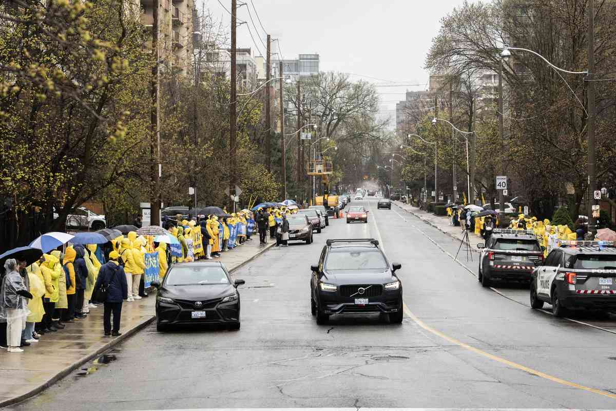 當天下午集會之後,部份法輪功學員在中領館附近的布魯大道(Bloor Ave.)拉起橫額,向路人講真相,過往路人向他們豎起大拇指、鳴笛,以表支持。